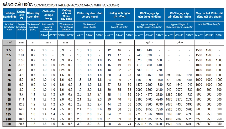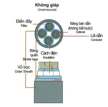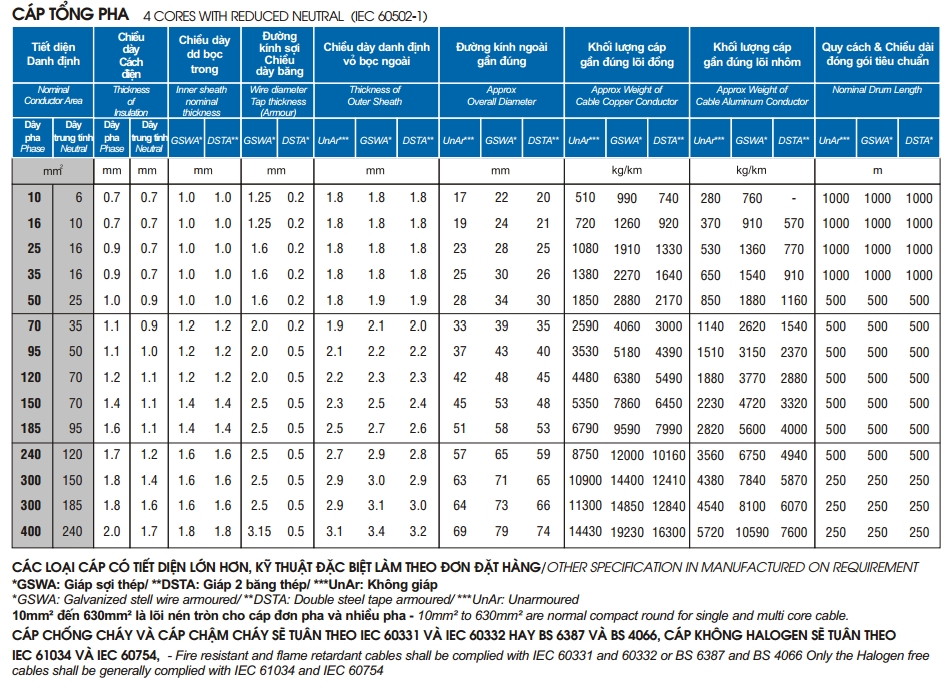 Cáp 4 lõi cách điện XLPE 0,6/1(1,2)kV & cáp tổng pha