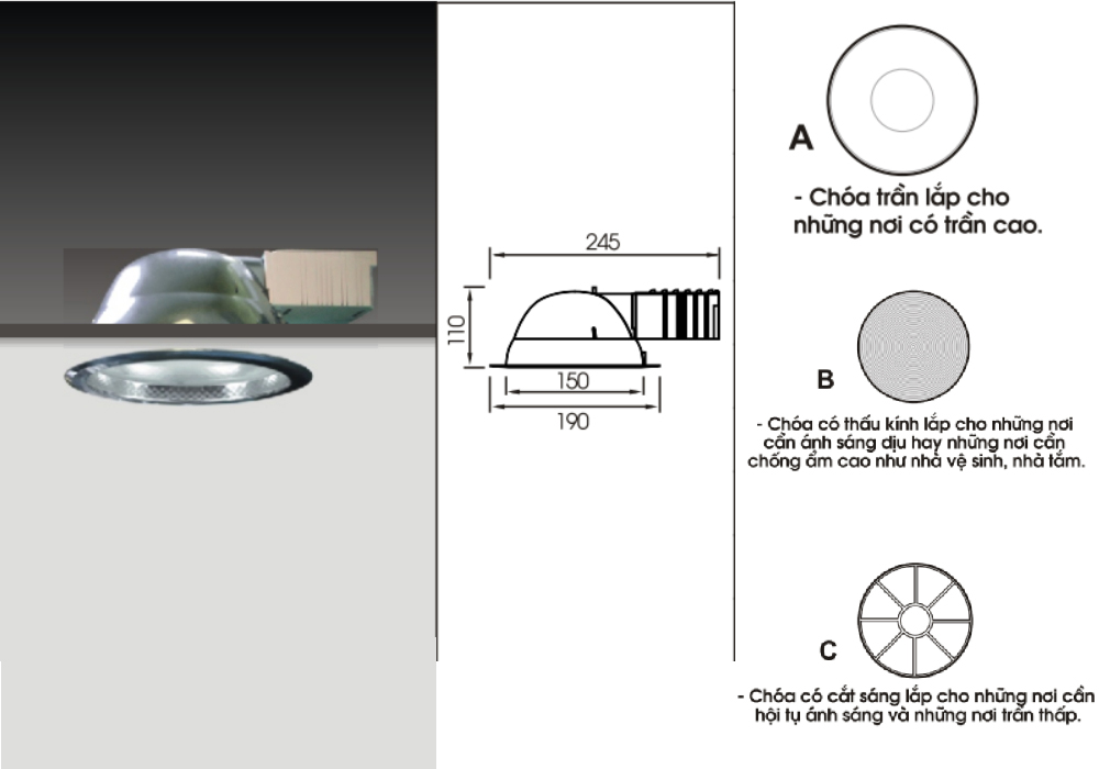 Đèn trần dùng bóng Compact tiết kiệm điện - loại lắp bóng chiều ngang - 245