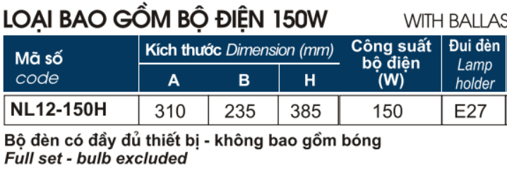 • Loại dùng bóng trực tiếp, bóng Compact, hoặc dùng với bộ điện lắp ngoài - công suất MAX 150W