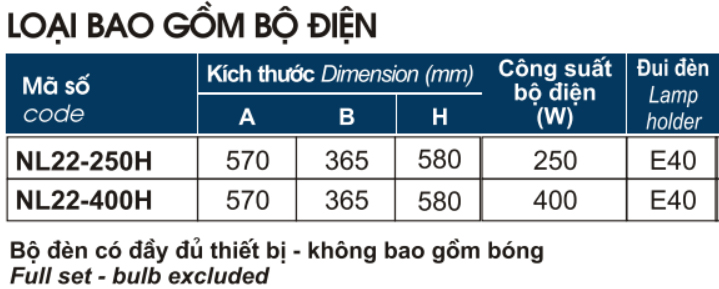 • Loại dùng bóng trực tiếp, bóng Compact, hoặc dùng với bộ điện lắp ngoài - công suất MAX 400W