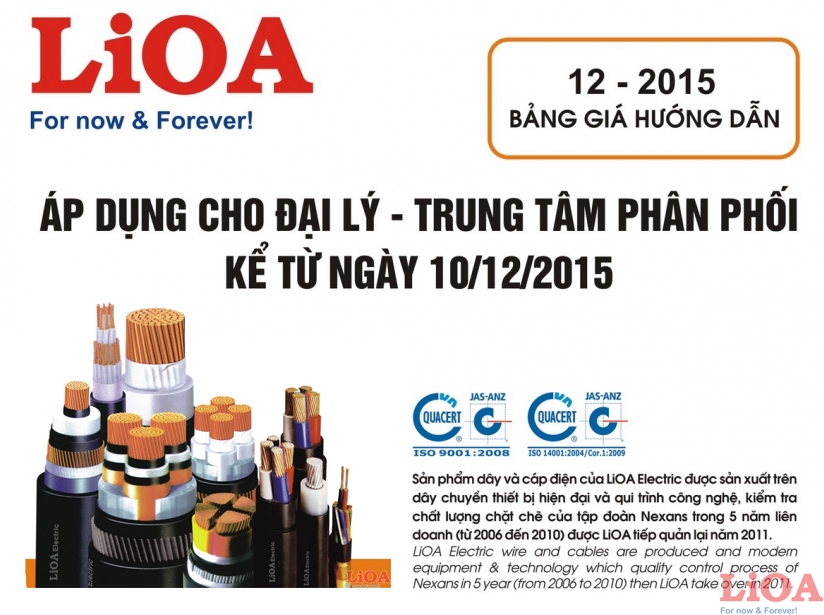 Bắt đầu từ ngày 10 - 12 - 2015 LiOA gửi tới các Đại lý và Trung tâm phân phối Bảng giá hướng dẫn Dây và Cáp điện.