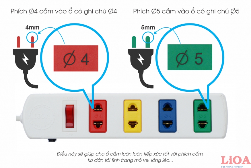 - LiOA thấu hiểu vấn đề này nên đã thiết kế loại ổ cắm mã TC và TS với cả 2 loại ổ phi Ø4 và phi Ø5 để người tiêu dùng có thể dùng đúng.