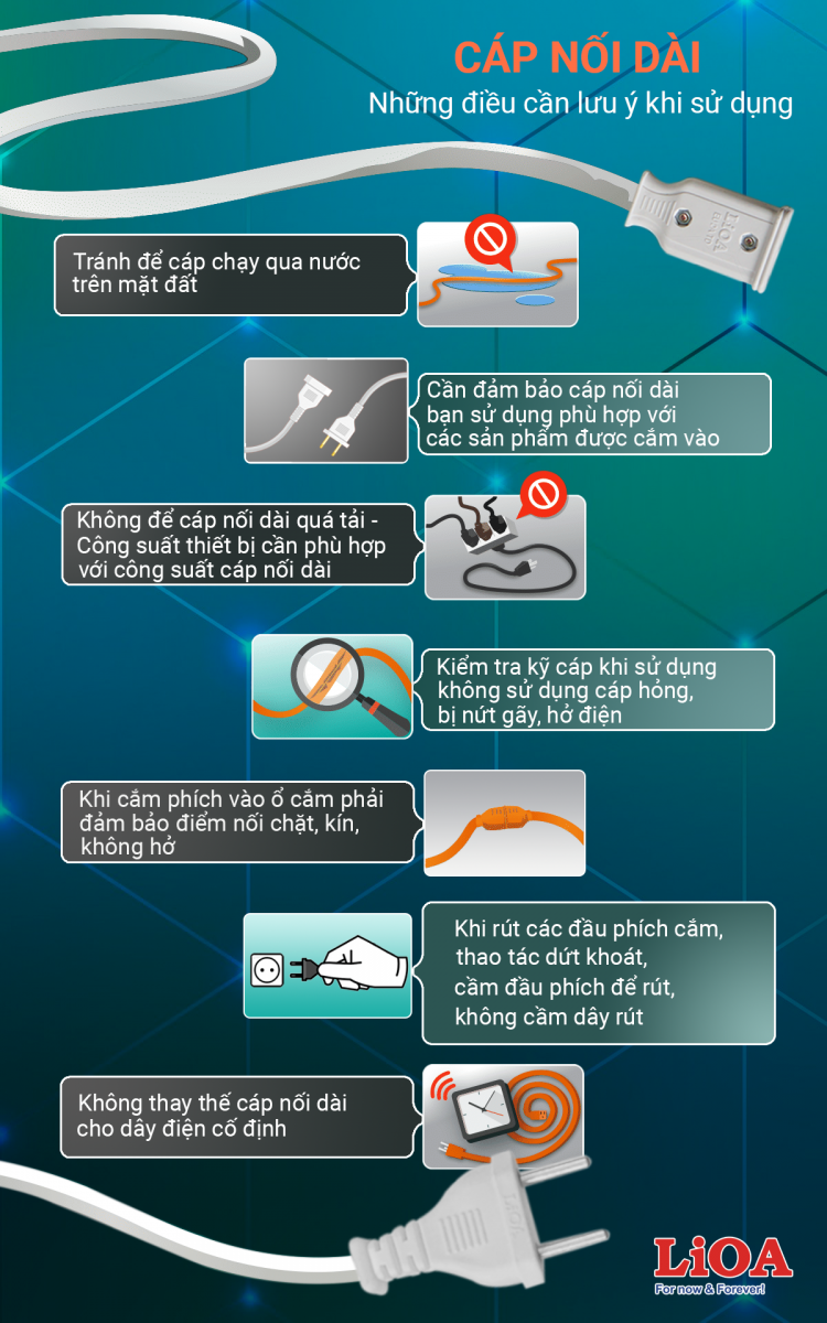 Bạn đang băn khoăn không biết làm sao cấp điện cho thiết bị ở xa mà vẫn tiết kiệm chi phí, thì các sản phẩm cáp nối dài LiOA sẽ giúp bạn làm điều đó. Cáp nối dài dùng để cung cấp điện cho các thiết bị có dây điện không thể kéo tới bất kỳ ổ cắm điện nào gần đó. Lựa chọn đúng loại dây nối là điều quan trọng để đảm bảo an toàn điện và ngăn ngừa hỏa hoạn trong nhà.