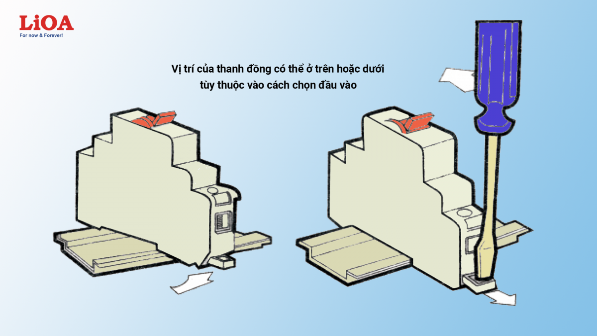 - Phần cố định của ngàm kẹp luôn được thiết kế nằm phía trên CB, khi lắp CB vào thanh ray ta móc phần ngàm cố định vào thanh ray sau đó dùng tay nhấn mạnh phần dưới của CB vào khi nào nghe tiếng tách là CB đã được lắp cố định vào thanh ray. Trường hợp ngàm kẹp cứng không nhấn xuống được ta dùng tua vít bật nhẹ như hình thì CB sẽ dễ dàng được lắp vào ngàm thanh ray.
