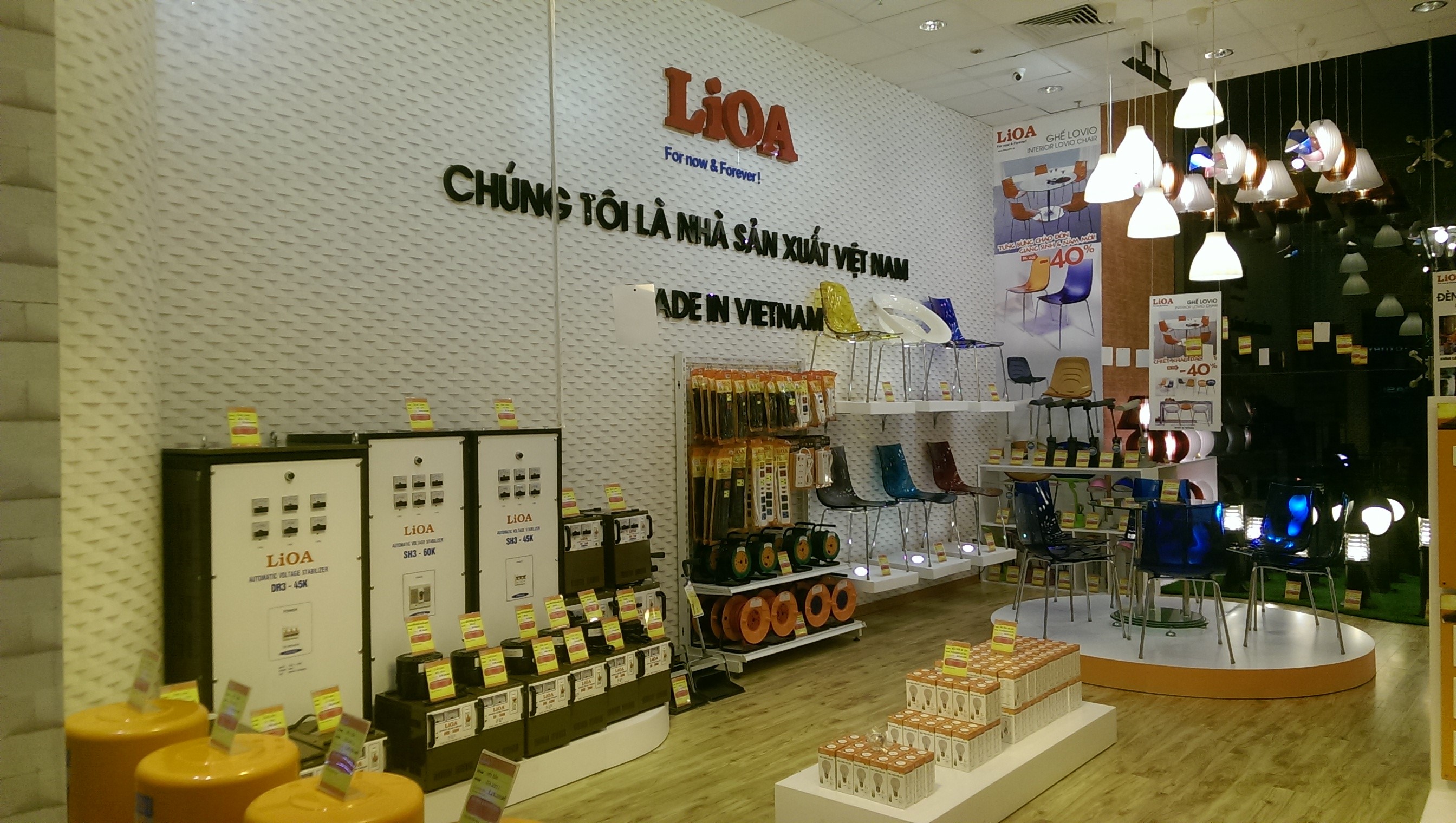 Khu trưng bày ổn áp, ổ cắm, đèn trong nhà & ghế Lovio