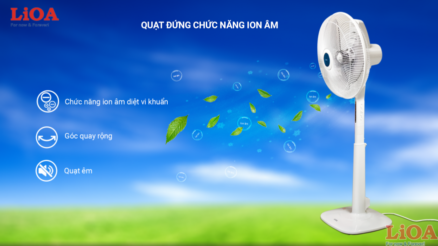 Theo các nghiên cứu khoa học thì ion âm có tác dụng lọc và khử mùi khó chịu, loại bỏ bớt các hạt bụi siêu nhỏ và các chất rắn lơ lửng trong không khí. Sự hiện diện các ion âm trong không khí được ghi nhận là giúp cải thiện sức khỏe tâm lý, năng suất và sức khỏe tổng thể cho con người, giúp giảm các triệu chứng dị ứng với bụi, bào tử nấm mốc và các chất gây dị ứng khác. Hiểu được các lợi ích này, LiOA đã ứng dụng công nghệ ion âm để cho ra dòng sản phẩm Quạt Đứng Chức Năng Ion Âm hiện đại.